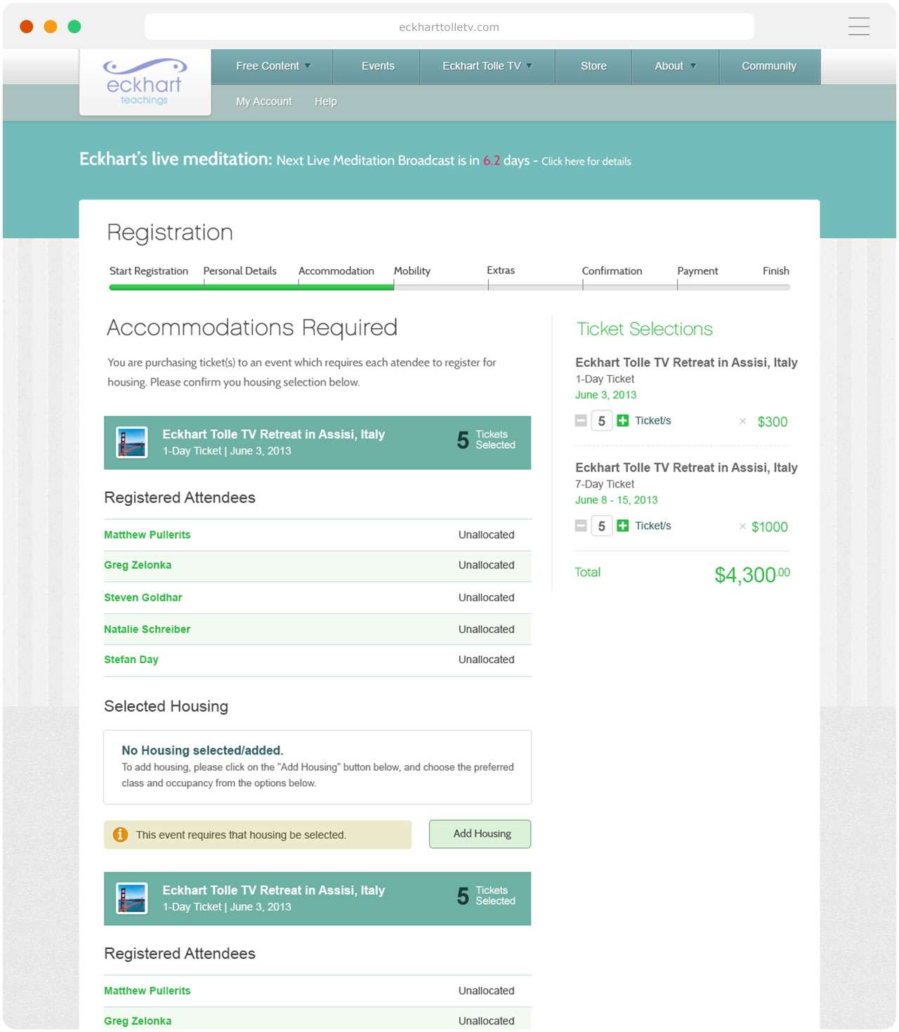 In the first quarter of 2013, an advanced hotel and ticket sales system was graphically designed and developed for Eckhart Tolle TV. The purpose of this development was to sell tickets and hotel rooms for an upcoming event in Italy; however, a robust and reusable ticket and hotel sales system was the end result.